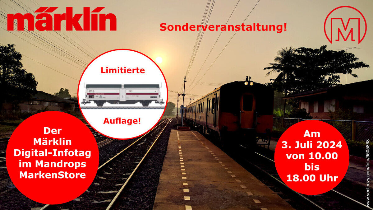 Wir sind schon ganz aufgeregt und gespannt auf unser nächstes Event zum Digital-Infotag von Märklin am 3. Juli 2024 von 10.00 bis 18.00 Uhr bei uns im Mandrops MarkenStore. Bei diesem Event kannst Du Dich über die moderne Digitaltechnik informieren. Denn erfahrene Trainer aus dem Hause Märklin erklären bei uns vor Ort die wichtigsten Kniffe rund um die Digitalkomponenten, veranschaulicht auf einer kleinen Showanlage. Ebenfalls im Gepäck sind erste Handmuster von neuen Modellen. Wir haben zur Veranstaltung einen Infotag-Sonderwagen, der während des Events zu einem Sonderpreis von nur 44,99 EUR angeboten wird. Natürlich nur solange der Vorrat reicht, da die Stückzahl pro Händler auf 20 limitiert ist. Wir bitten um Anmeldung mit Angabe des Sonderwagens ob dieser gewünscht wird per E-Mail an: events@mandrops-germany.de oder auf unserer Website unter Veranstaltungen. Die Teilnehmerzahl ist begrenzt, daher musst Du schnell sein, wenn Du an unserer Veranstaltung teilnehmen möchtest. Änderungen vorbehalten.